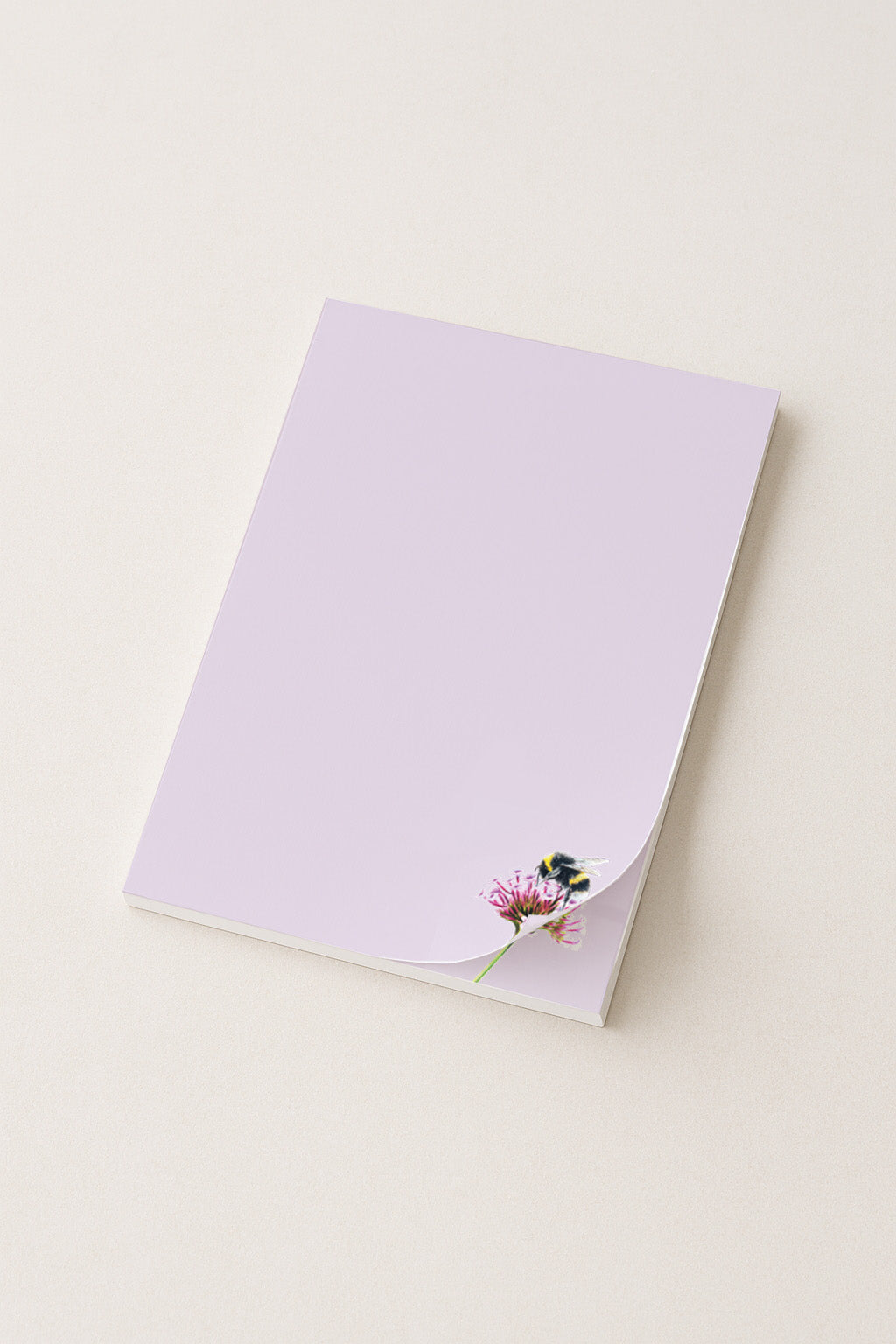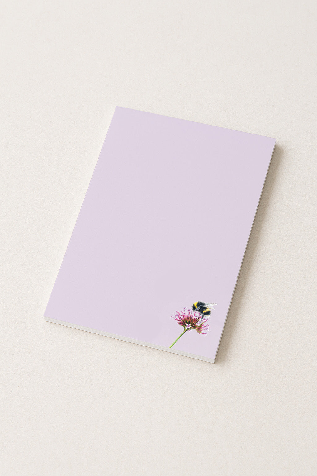 Dieser niedliche Notizblock in A5 in einem angenehmen Flieder und der Hummel auf der Blüte lassen das Schreiben von Notizen, Einkaufslisten und Briefen noch schöner werden.