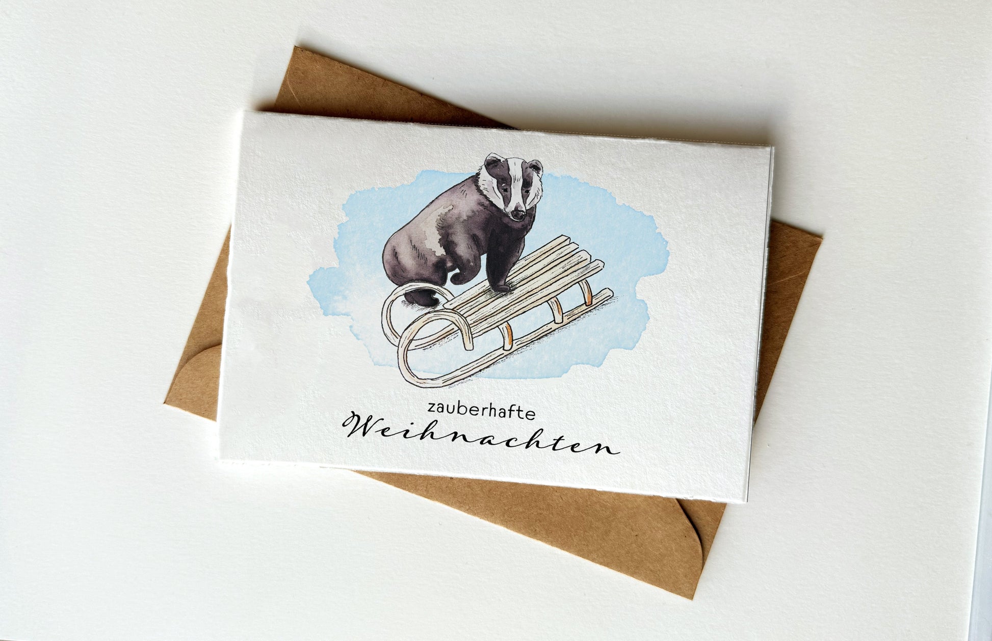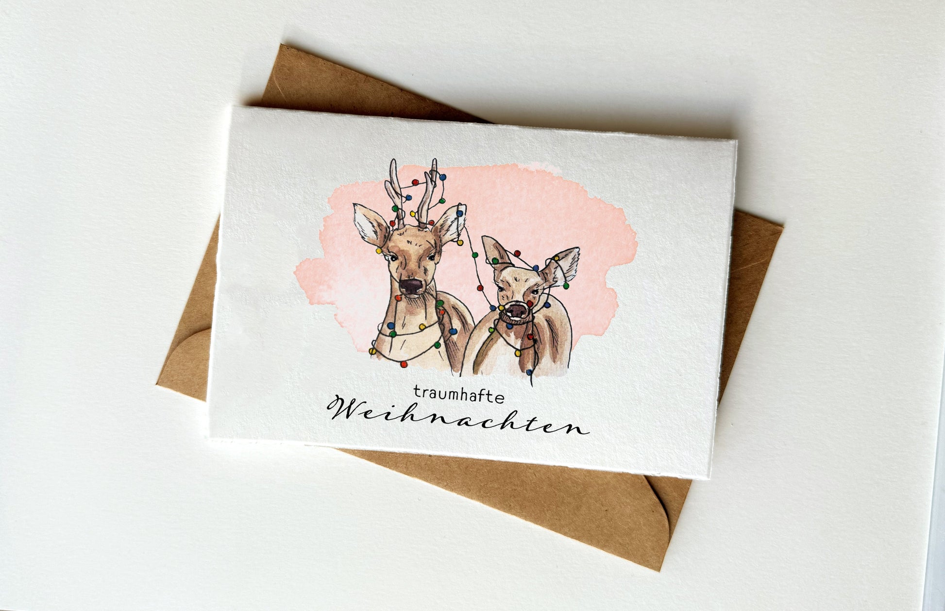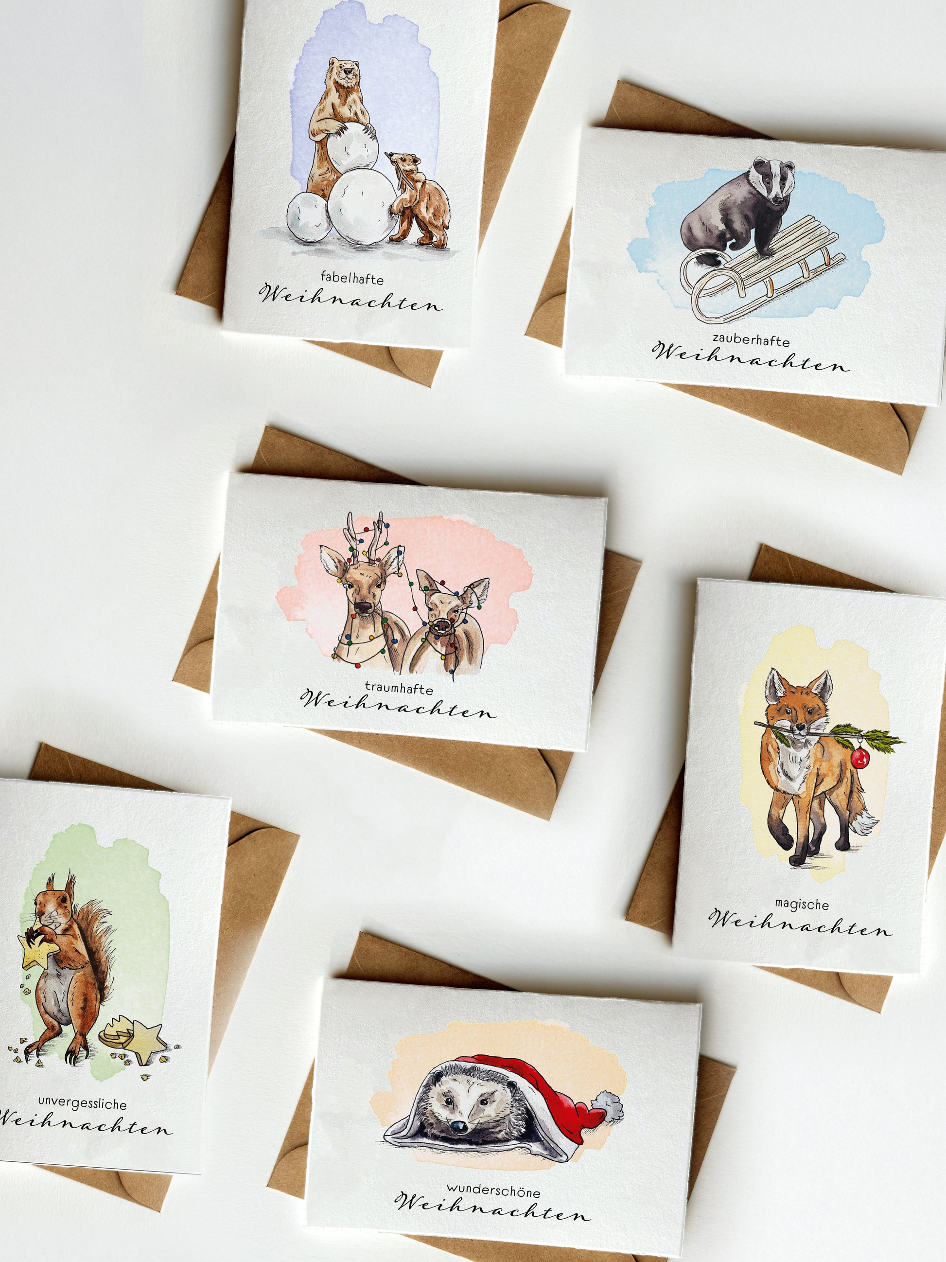 6 verschiedene Aquarellmotive mit 6 verschiedenen Arten "frohe Weihnachten" zu sagen. Inklusive Umschlag aus Kraftpapier.